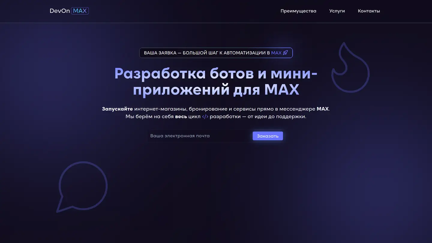Задача Сервис DevOnMAX занимается разработкой чат-ботов и мини-приложений для российского мессенджера MAX. Им нужен был современный сайт для привлечения клиентов, который создавал бы технологичный образ компании, быстро собирал заявки, показывал каталог услуг с ценами и автоматически обновлялся без участия программистов.